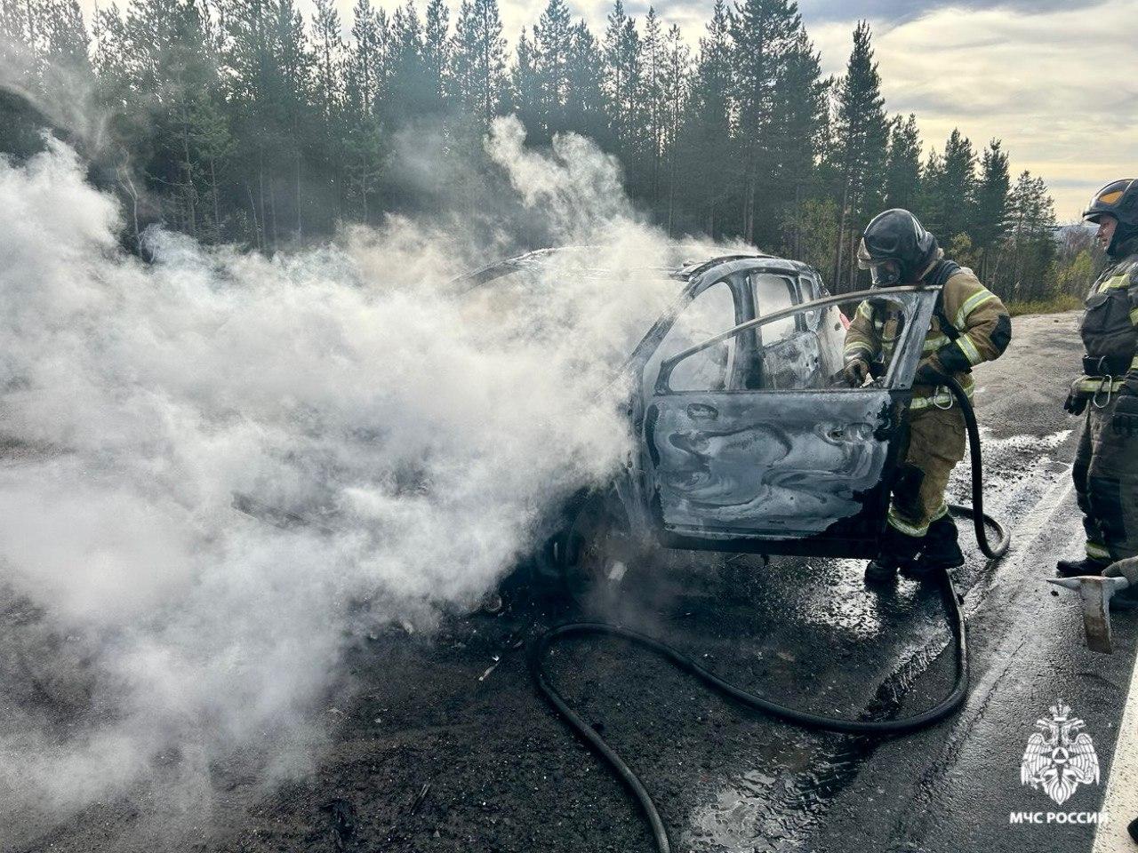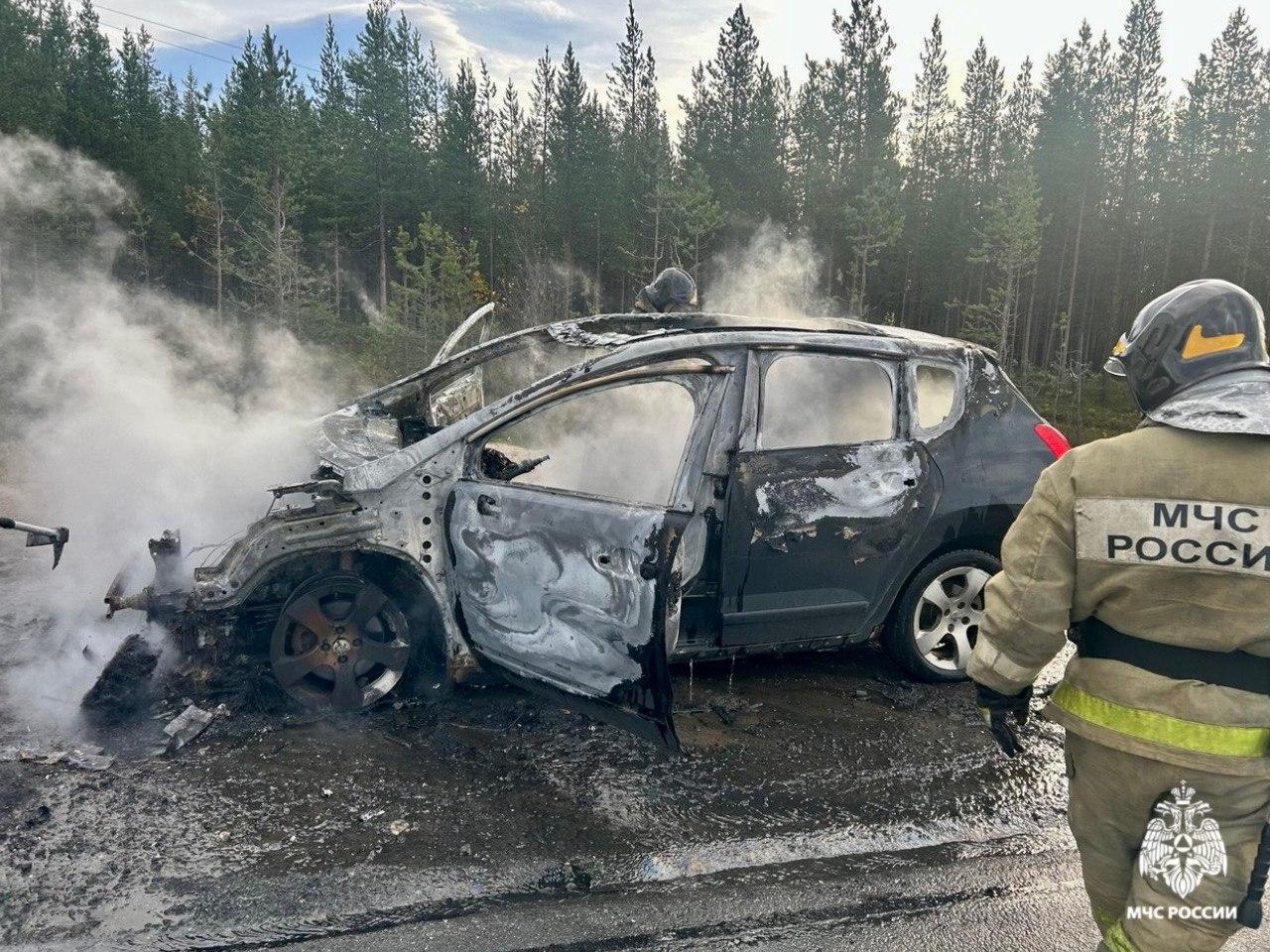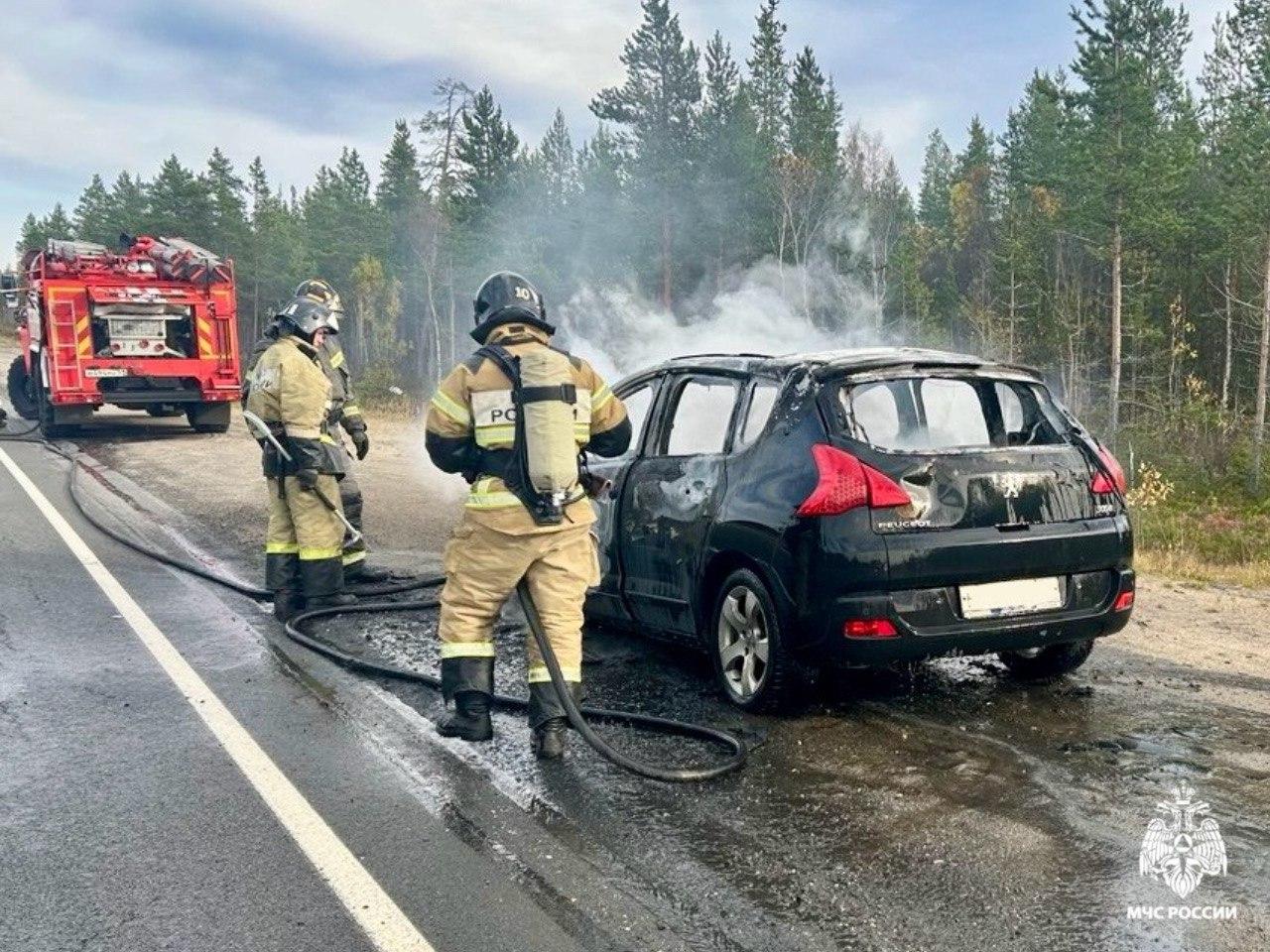 В 12:49 29 сентября на 1227 км трассы "Кола", под Оленегорском, загорелся автомобиль "Пежо 3008". На место происшествия выехали сотрудники ГУ МЧС России по Мурманской области.