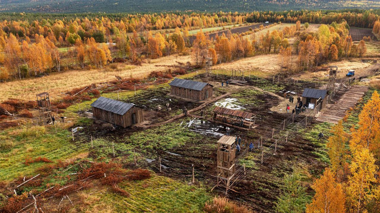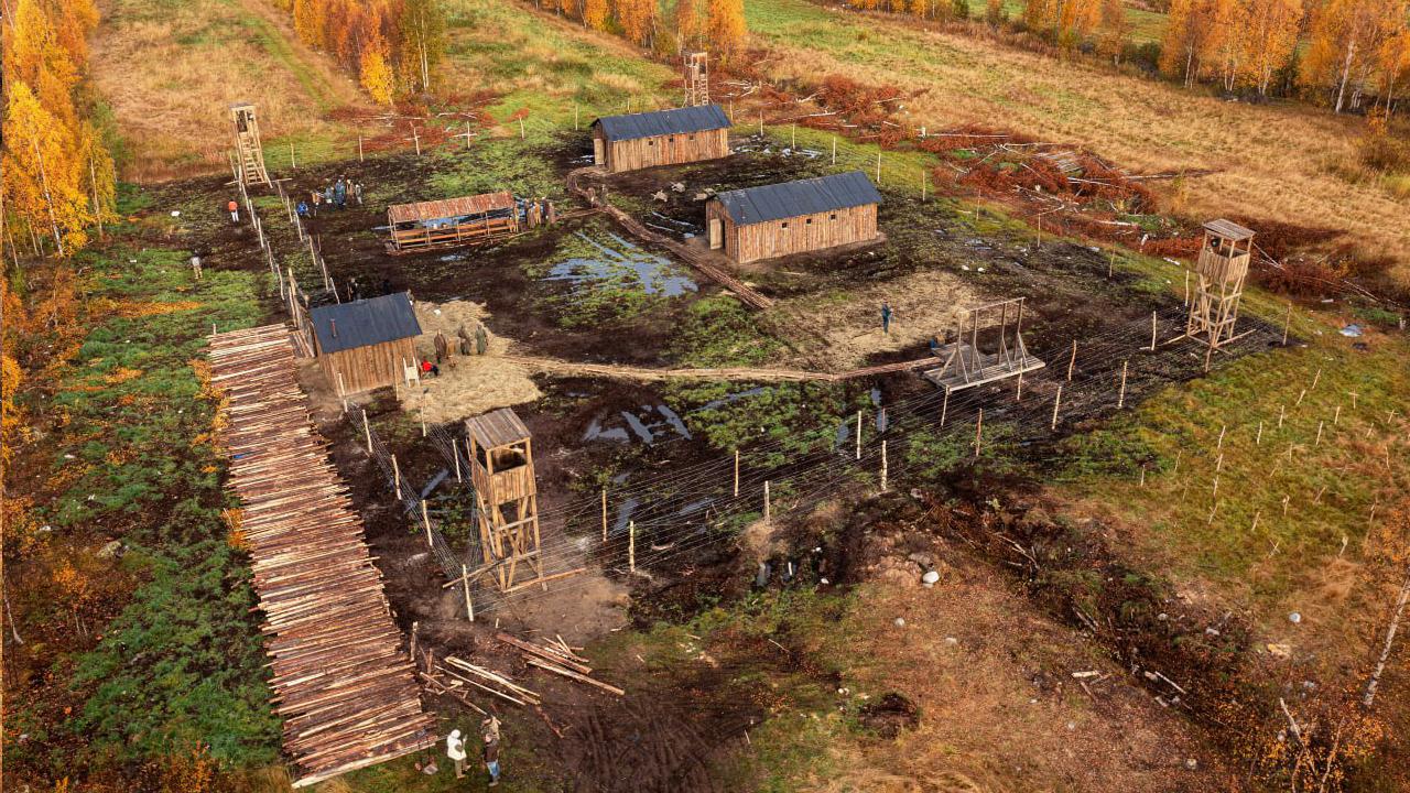 Неделю назад стихия сильно потрепала декорации, построенные для военно-исторической драмы "Ушедшие в метель" в районе Лувеньги. В них планировали снимать эпизод, действие которого происходит в норвежском лагере для советских военнопленных. Ветер перевернул вышки и даже смел со столбов колючую проволоку, которую с таким трудом выискивали по разным регионам. А территория превратилась в грязное болото.