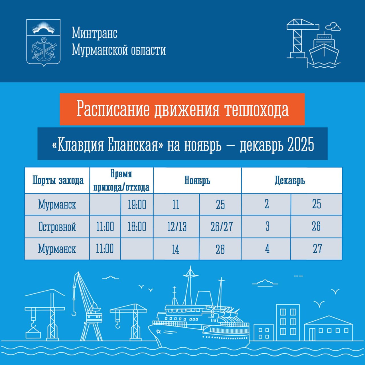 Министерство транспорта и дорожного хозяйства Мурманской области представило расписание движения теплохода "Клавдия Еланская" на ноябрь и декабрь 2025 года.
