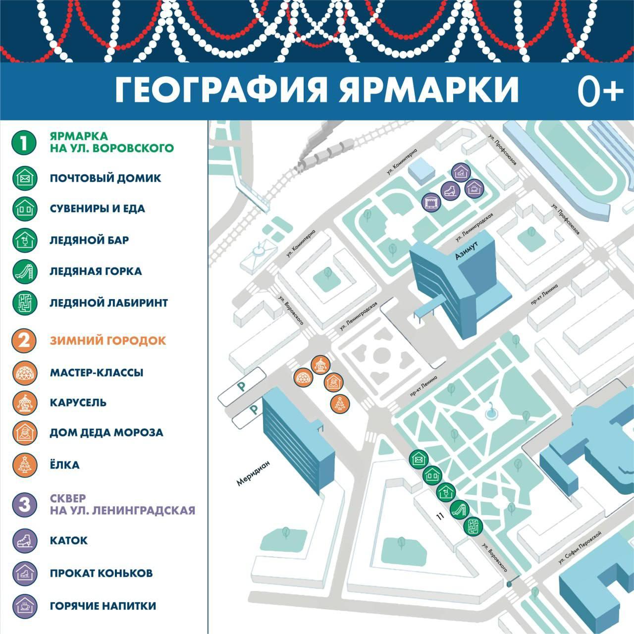 На улице Воровского, по традиции, откроются павильоны с новогодними елками, сувенирами, рыбной продукцией и блюдами арктической кухни. Также в этой зоне разместятся ледяной бар, детский лабиринт-ловушка и почтовый домик, через который можно будет отправить открытку в любую точку мира.